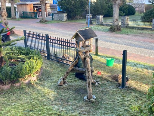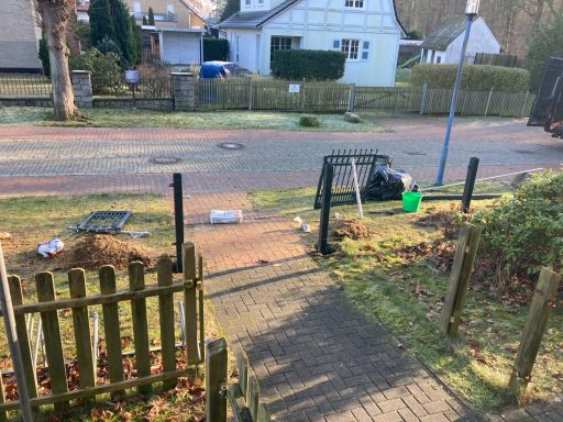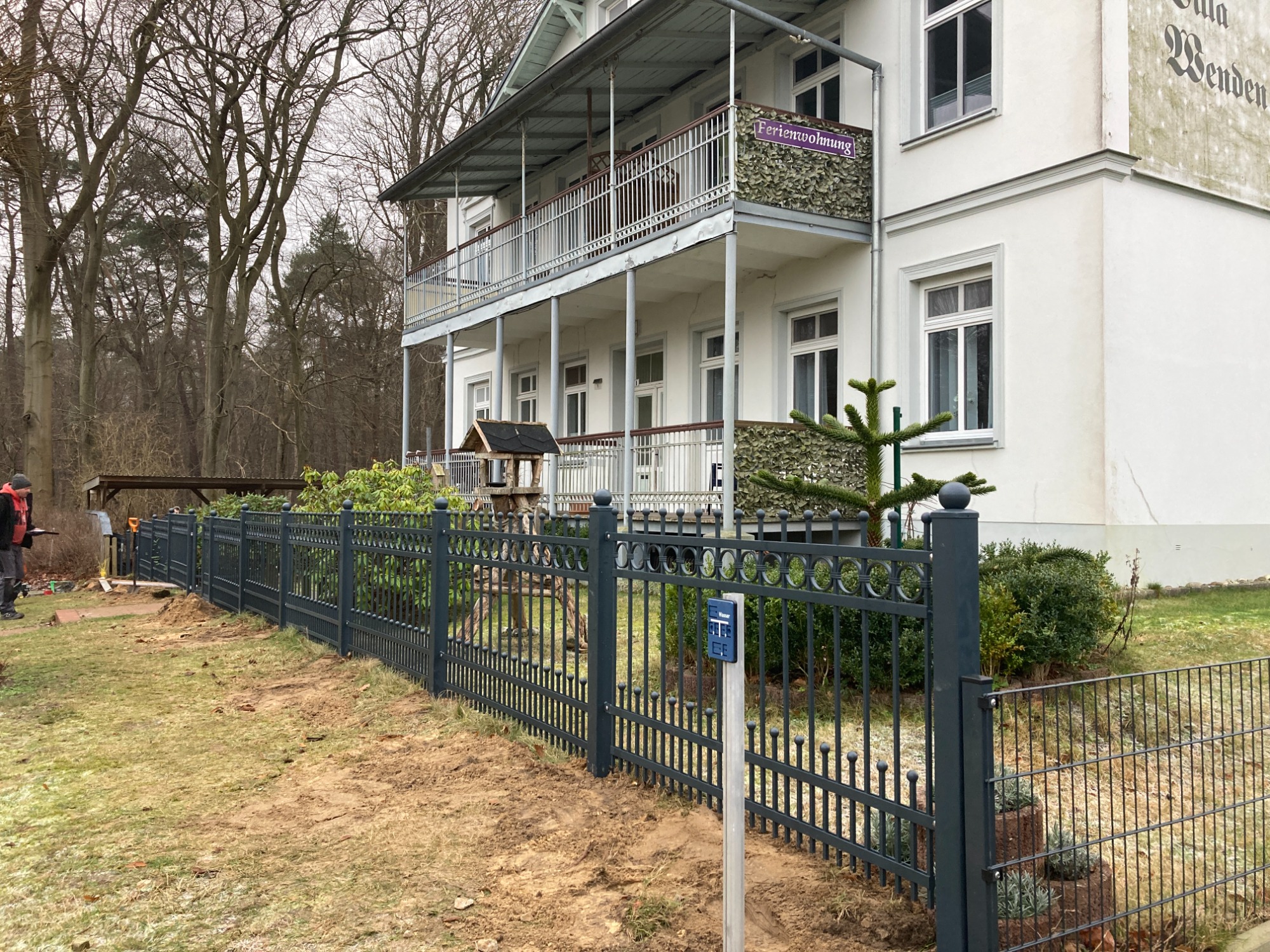 Im Januar 2025 wurde unser neuer Zaun aufgestellt und der in die Jahre gekommene Holzzaun entfernt. Wir hatten uns in Absprache mit dem Denkmalschutz für einen Metallzaun mit ähnlichen Ornamenten wie an der Veranda des Hauses entschieden.